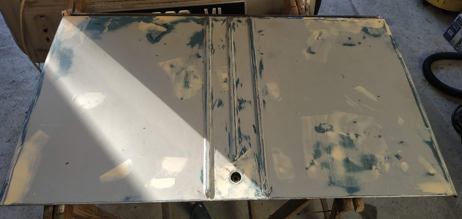 Ce weekend, j'ai débosselé le capot + ponçage + masticage.