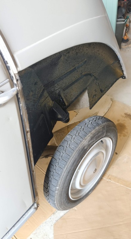 Aujourd'hui, j'ai mis une première couche d'anti rouille sur les gardes boues coté caisse ( à l'arrière ).