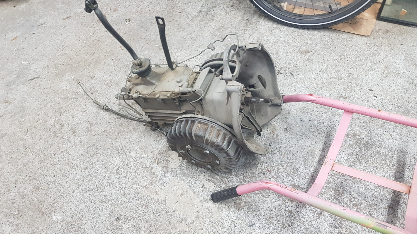 Je vais donc la voir, elle est niquelle !!! et je repart donc avec une boite, un moteur am2a complet, une sortie d’échappement, un volant moteur en rab et des enrouleurs de ceinture avant !! le tout pour 200€ !!!