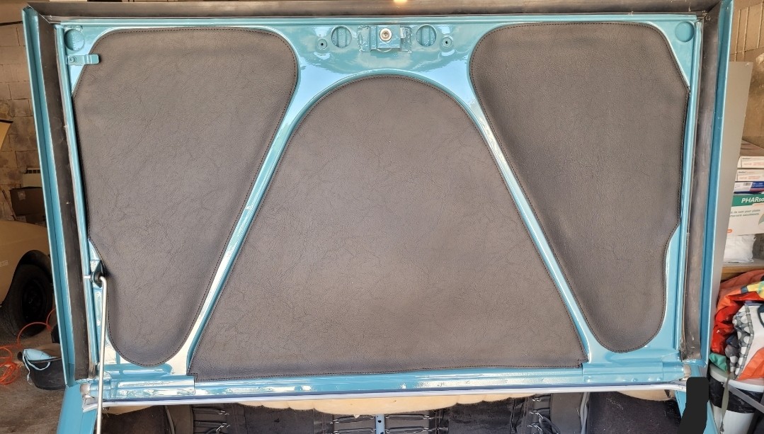 Et hop, voilà le résultat, pas d'origine oui mais propre: Les armatures étant peinte en bleu camargue, je les ai repeintes en noir plus passe partout. Cette planche est bien pratique mais elle est très moche, avec quelques tombé de moquette, on lui refait une beauté Et on en profite pour s'occuper du coffre avec un petit habillage acheté chez Mcc Se sera tout pour le compartiment arrière.