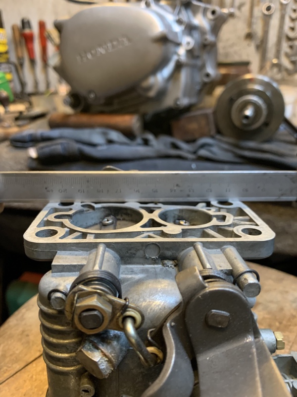 -> démontage complet, barbotage Meca 33 aux US à 55 degrés, soufflette partout, remontage méthodique, réglage du niveau de cuve, vérification de l’étanchéité du pointeau, vérification visuelle de tous les gicleurs air et essence, mise en place de quatre joints à lèvres gris dans les épaulements prévus, sur les axes de papillons des deux corps, changement du joint de couvercle des cuves ( identique par superposition à celui d’origine ) ; démarrage correct, mise en température progressive, et…