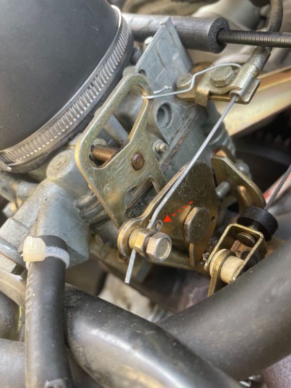 Il me manque un axe sur mon carburateur Solex double corps de 2CV6. Il semble qu'il soit tombé. Du coup, j'ai dû accrocher le volet qui pivote avec du fil de fer. Il semble que la fonction de ce dernier soit uniquement liée au starter (?).