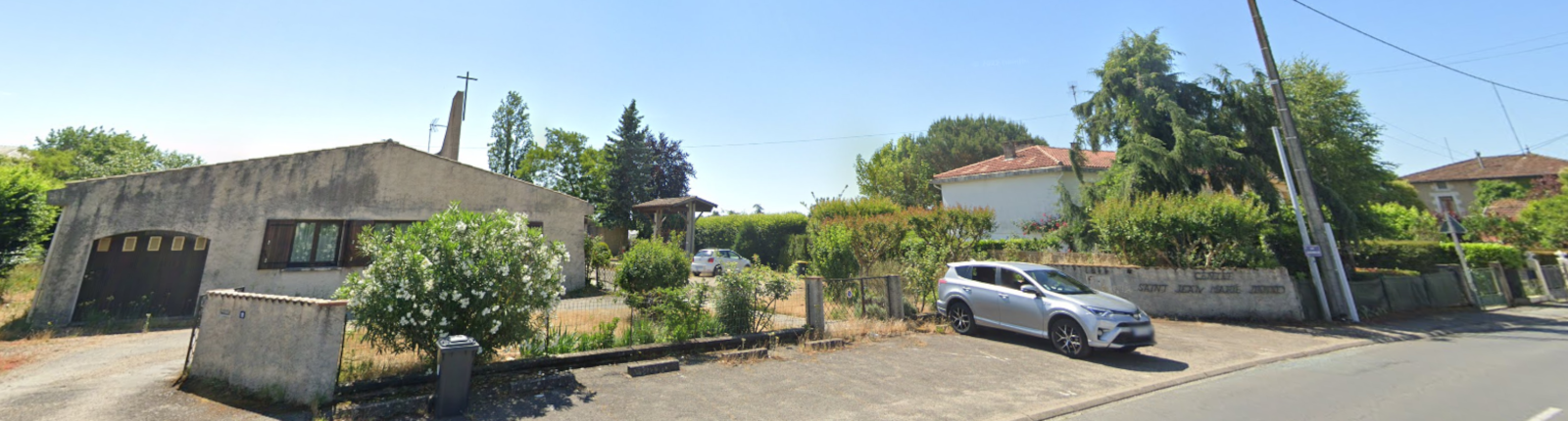 La maison devant est le logement du curé (avec la porte du garage, bien visible)