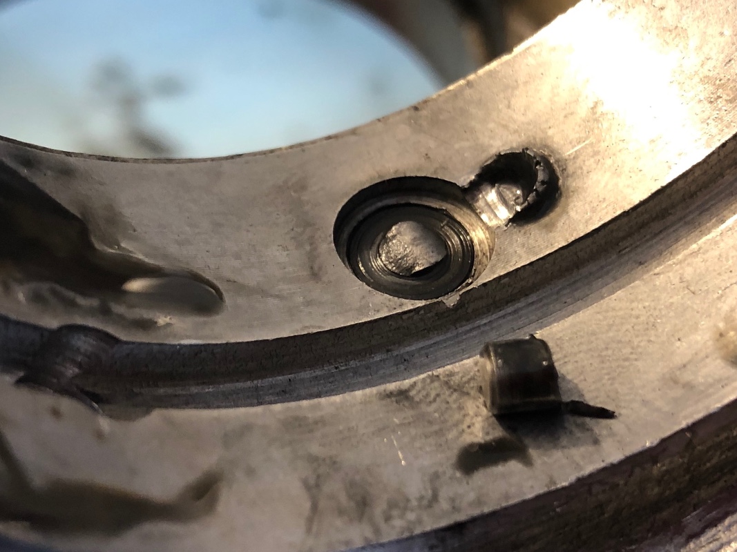 Je pense pour un souci de lubrification (le moteur a déjà été refait et il y a de la pâte à joints un peu partout ...). Grippage du palier sur le vilo et entrainement brutale du palier, en rotation. Couic pour le pion ! Et blocage immédiat et complet du moteur !