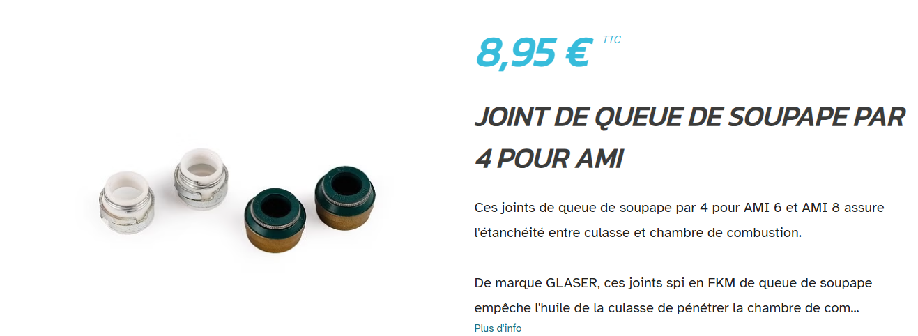 GERARDDU79 a écrit : 03 janv. 2025, 17:09 Bonjour, je cherche des joints de queue de soupapes pour mon 435cm3 ami 6 de 1964, il y a AM 112 1 de gravé sur les culasses. sur la plaque moteur AM.M. D'origine il n'y en a pas mais je trouve que le moteur fume trop, la cylindrée est neuve. de plus le moteur démarre vraiment mal. merci je suis preneur de toutes les infos. Cordialement. Gérard.
