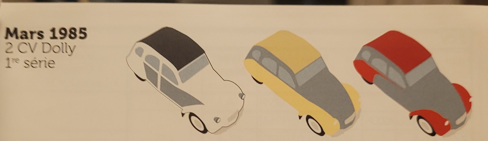Bonjour, la Dolly est sur la base de la 2CV spéciale, petit compteur de vitesse, sièges gris à losange, les mêmes que la charleston, enjoliveur de roues et pneus en 125x15