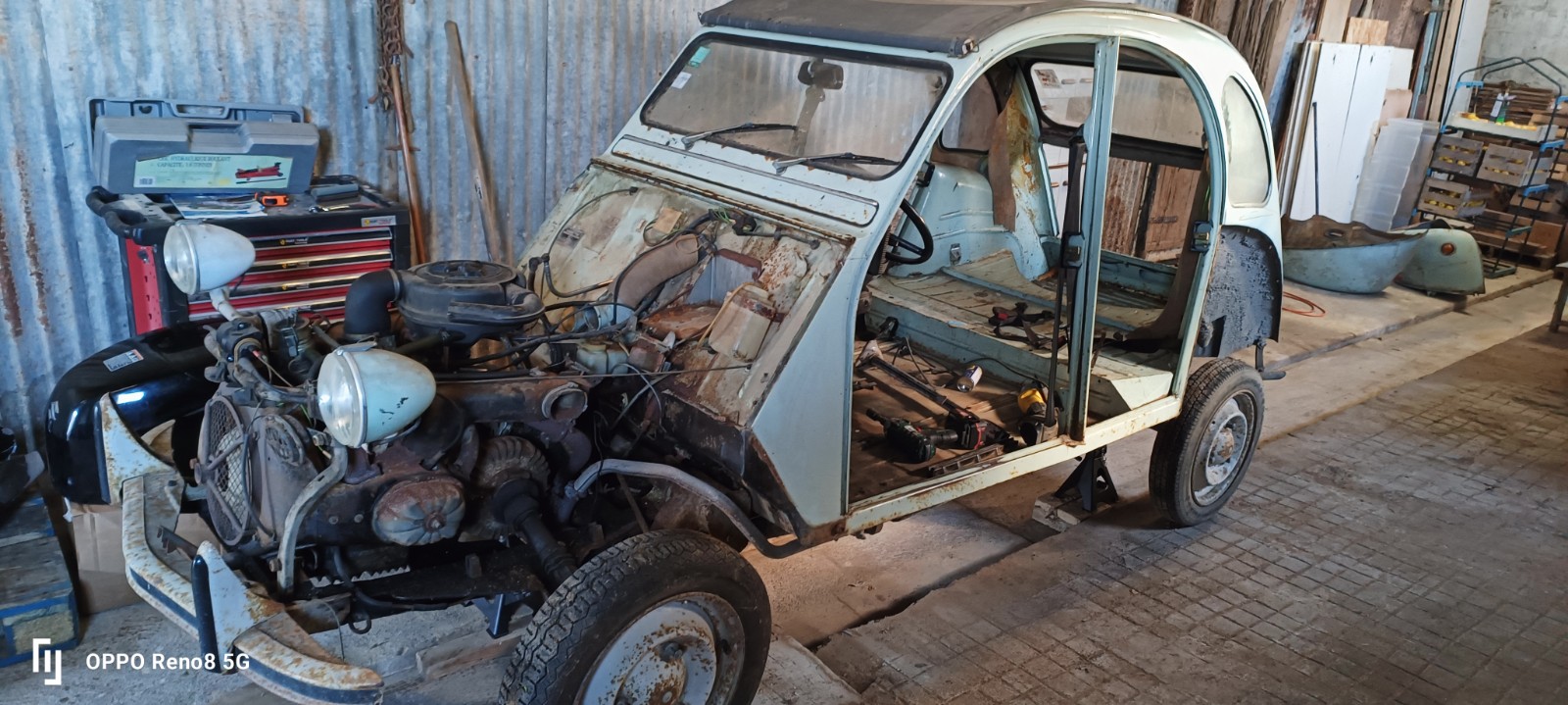 Récemment, belle maman nous a offert la 2CV, avec comme projet que je la rénove pour qu’elle puisse à nouveau rouler avec, en souvenir du bon temps.