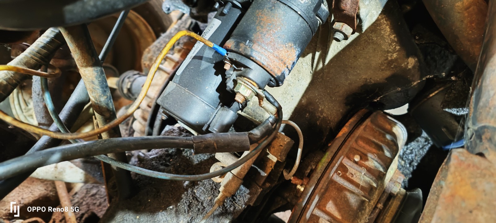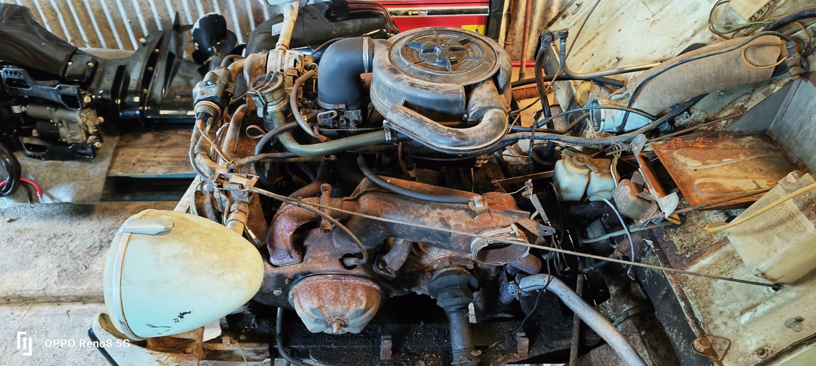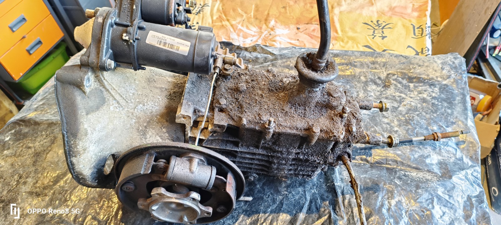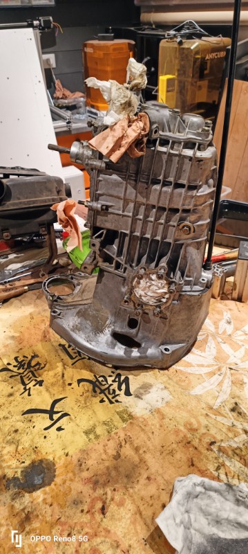 je vais commencé par le groupe moteur boite, je l'ai amené à la maison dans mon atelier pour travailler plus facilement dessus. en effet belle maman habite à 180 km et pour avancer plus vite, j'apporterai surement les pièces transportable à la maison, pour limiter les allez retour.