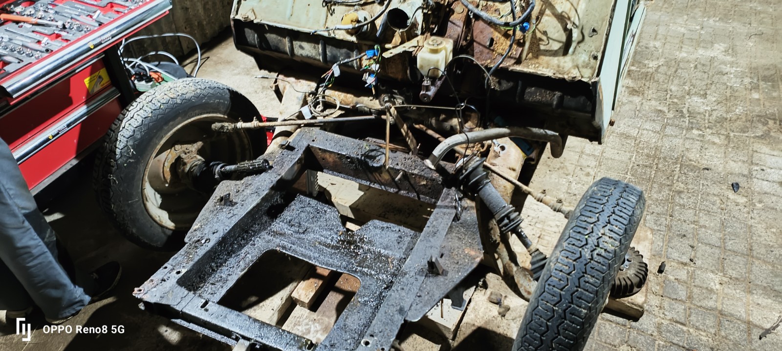 Le Châssis : A ce stade le châssis parait être en état, mais il faudra surement lui faire un coup de jeune, nettoyage, sablage ou ponçage, puis un traitement antirouille et anti gravillons sera nécessaire. Les amortisseurs et surpension seront remplacé pour partir sur une base saine, le circuit de freinage sera aussi refait. Les essieux seront révisés.