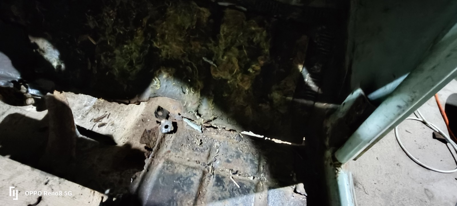 Le chassis: le châssis parait en état, rouille de surface, seul un trou sur la partie planché passager. on va enlever la tôle (planché central) ce qui permettra de voir l'intérieur du caisson et valider ou non l'état du châssis.