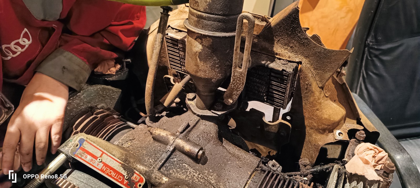 Une fois les tôles démontées, on a nettoyé le moteur, que dis je décrasser le moteur. la première étape a été de prendre des couteaux à mastique pour décoller la couche de cambouis de 5 mm d'épaisseur par endroit.