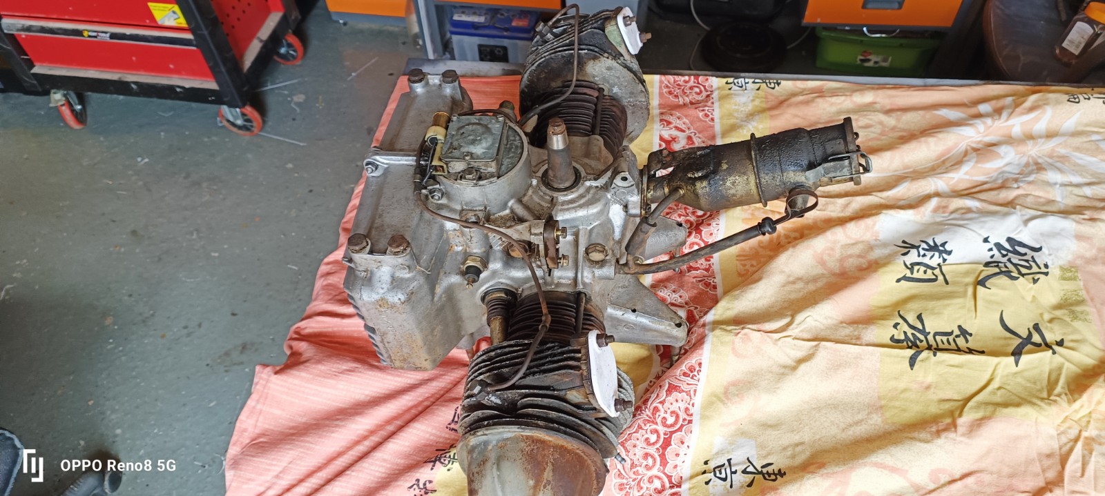 Le moteur est arrivé sur l'établi, j'ai opté pour un démontage nettoyage, j'aurai pu donner un grand coup de nettoyeur haute pression avec dégraissant, mais ne connaissant pas le moteur, j'ai préféré le faire progressivement.