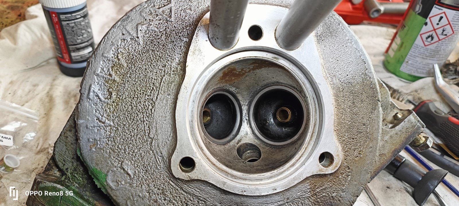 on remet la bougie, puis on rempli la chambre de combustion de dégrippant. sur la culasse que j'ai, la soupape d'échappement n'est pas étanche, on observe le liquide frein qui s'écoule par l'orifice d'échappement.