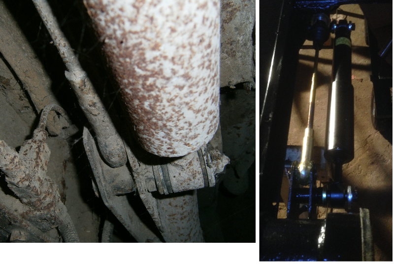 vue du coté pot de suspension la situation n'a pas l'air terrible , je m’aperçois que j'ai des brancards longs contrairement a toutes les restau que j 'ai pus voir sur le forum et de plus , une traverse notée par la flèche que je n'ai jamais vu nulle part ? .